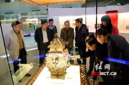 2015年4月22日,湖南省文化厅党组成员、副厅长、省文物局局长陈远平(左2)陪同国家文物鉴定委员会青铜组的委员们参观展览,观摩皿方罍。