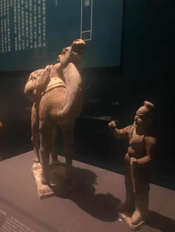 展出现场,唐彩绘陶载丝囊骆驼,唐三彩胡人牵驼佣