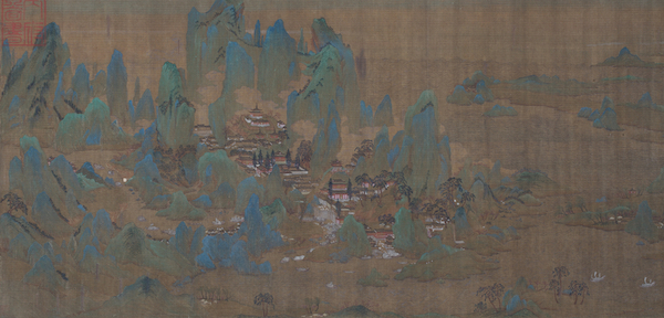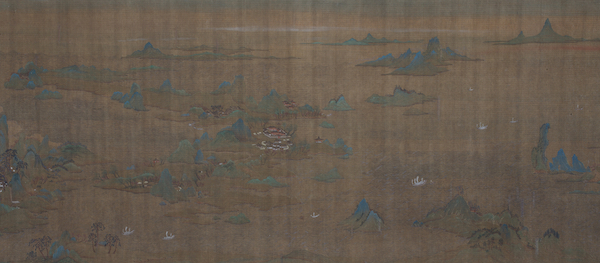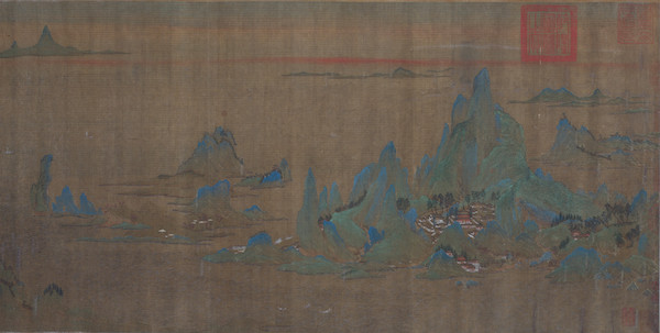 唐代李思训(传)《海天落照图 》同样是绢本设色, 纵46.7厘米,横244.9厘米,传为唐代画家李思训所作。李思训(651—716年),甘肃天水人,唐朝宗室,官至武卫大将军。精擅青绿山水画,时人有“国朝山水第一”之评,画史上称其为“大李将军”。其子李昭道也能继承家学,后世称为“小李将军”。明代董其昌提出绘画的南北宗论,把他列为“北宗”之祖。图卷以青绿泥金描绘山海间楼阁掩映,殿宇交错;落霞中波浪映照,帆影摇动。画面勾勒精到,渲染细致,红霞、青山、绿树、金殿交相辉映,方寸间营造出繁复景象。图上钤有“建业文房之印”、“内府图书”等仿造五代和宋代内府的伪印。卷后附有鲜于枢《海赋》等题跋也系伪造。隔水上清代沈荃的题跋可靠。图中钤盖多方清宫玺印,并于《石渠宝笈初编》中著录。此作虽是明代画师所仿制的“苏州片”,但绘画技巧不俗,勾染精到,亦属上乘之作,一定程度上反映了唐宋时期青绿山水画的面貌,在研究古代青绿山水画方面具有参考价值。