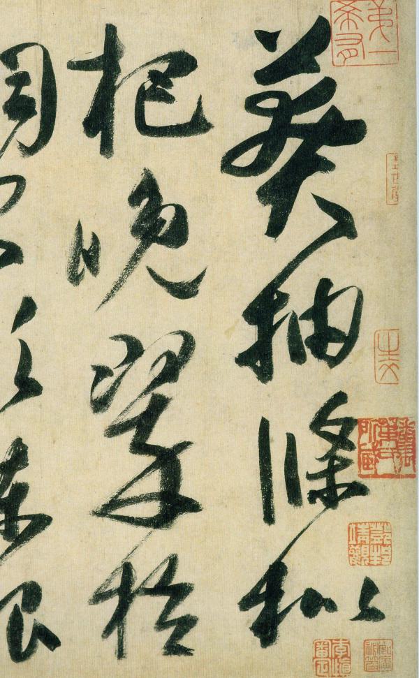 《草书古诗四首》(局部),墨迹本,五色笺,凡四十行,一百八十八字。传为张旭狂草之作(目前仍存争议),极为珍贵。其内容,前两首是庾信的《步虚词》,后两首是南朝谢灵运的《王子晋赞》和《四五少年赞》(疑为伪托)。通篇笔画丰满,绝无纤弱浮滑之笔。行文跌宕起伏,动静交错,满纸如云烟缭绕,实乃草书颠峰之篇。今人郭子绪云:“《古诗四帖》,可以说是张旭全部生命的结晶,是天才美和自然美的典型,民族艺术的精华,永恒美的象征。”(《中国书法鉴赏大辞典》)。