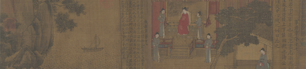 唐代阎立本(传)《孝经图卷》为绢本设色,纵19.7厘米 横529厘米,此卷根据儒家经典《孝经》十八章绘成,每章一图,前附《孝经》原文,共分为十八段。所绘人物场景微小细腻,名物制度有据可循。清初收藏家孙承泽跋中认为此卷为阎立本绘、褚遂良书,但分考二人书画技巧与此卷多不相侔,图中线条及人物造型更近于萧照《中兴瑞应图》和南宋《卤簿玉辂图》。书迹中也避讳宋太祖、孝宗名字“匡”“慎”,以及经书原文抄写字体书法极不规整,有专家认为此卷图文皆出于南宋孝宗以后民间画师之手。早期流传经过待考,曾经《庚子消夏录》《江村书画目》《石渠宝笈》著录。