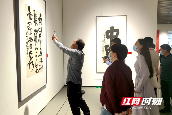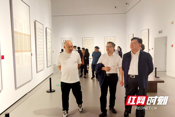 中国书协副主席、湖南省文联主席、省书协主席鄢福初(右一)等出席开幕式并观看展览。