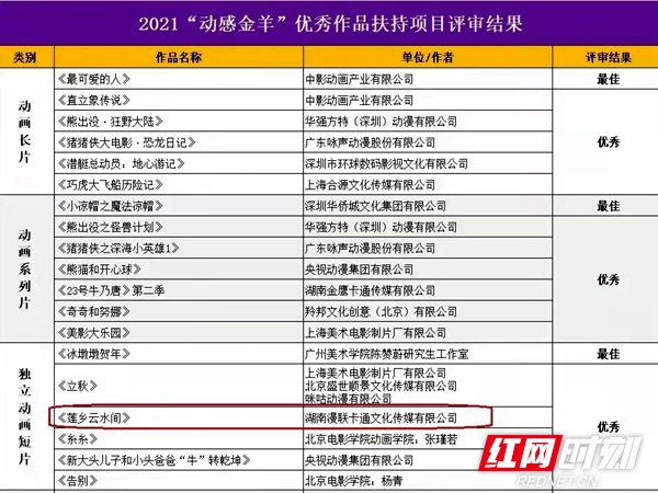 湖南漫联卡通文化传媒有限公司的作品《莲乡云水间》荣获第十二届漫博会“动感金羊”优秀作品扶持项目“优秀独立动画短片”。