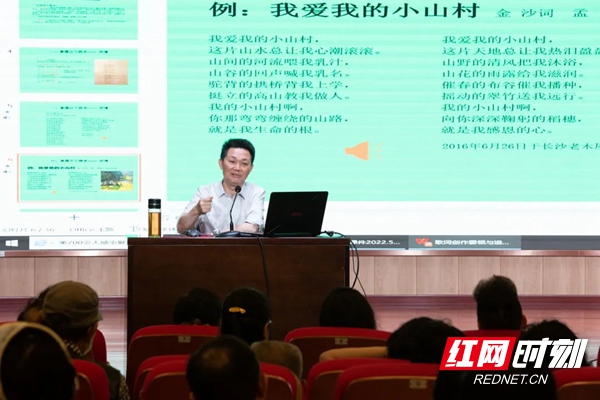 金沙以《歌词创作要领与追求》为题,结合创作《我爱我的小山村》《报春花开》《美丽湘江》《奔驰在祖国大地上》《阿妹出嫁》《尖尖歌》《唱起我和我的祖国》《通道转兵组歌》等歌曲的思考,与众多歌词创作爱好者分享自己数十年笔耕不辍所积累的丰富创作实践经验和独特的深刻感悟。