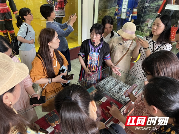 有“神州瑶都”之美誉的江华,拥有瑶族独有的风貌。来到江华,不得不提及一个人物——瑶族先祖盘王。在中国瑶族第一殿——盘王殿,采风团一行参观瑶族生产生活用具、典祀、特色服饰,了解瑶族的起源发展,用最直观的视角看见瑶族悠久的历史文化。