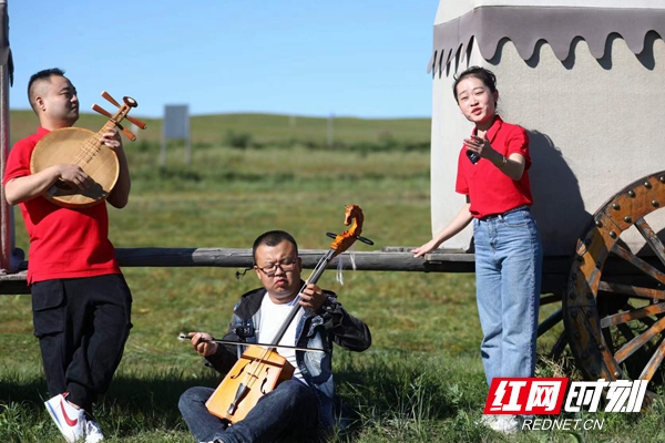 长沙弹词传承人王志敏(左一)、内蒙古自治区额尔古纳市“乌兰牧骑”队员赛吉日胡(左二)、湖南花鼓戏传承人文君(右一)在草原上即兴创作。