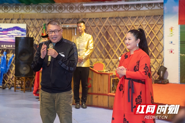 内蒙古文联党组成员、副主席包银山(左一)出席活动,并与原空政文工团独唱演员、湖南瑶族歌唱家易秒英现场互动表演节目。