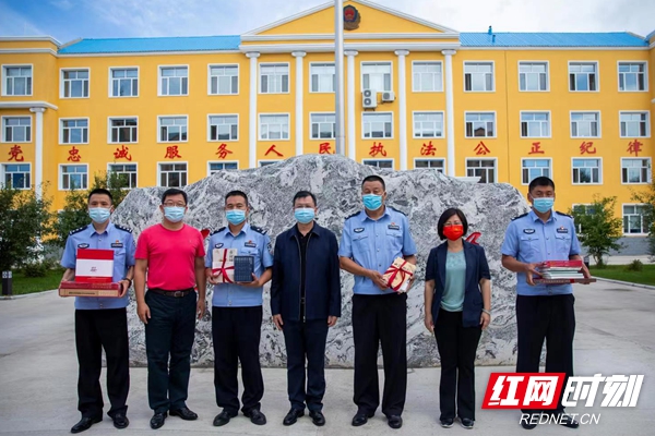 湖南省文联党组书记、副主席夏义生(中),湖南省文联党组成员、副主席张纯(右二),湖南省文联副主席大兵(左二)为呼伦贝尔市额尔古纳出入境边防检查站赠送图册、书籍。
