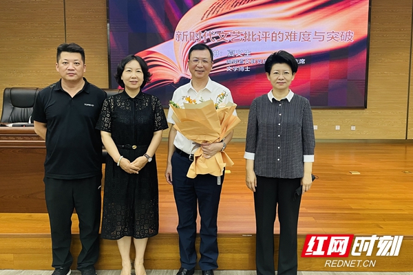 湖南省文联党组书记、副主席夏义生(左三)主讲敕勒川文艺大讲堂,开启湘蒙文艺志愿交流,并与内蒙古文联党组书记、主席冀晓青(左四),内蒙古文联党组成员、副主席闫艳(左二),内蒙古文艺评论家协会副秘书长王宏伟(左一)在讲座现场合影。