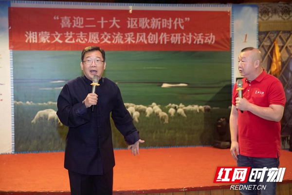 湖南省文联党组书记、副主席夏义生,内蒙古文联党组书记、主席冀晓青,内蒙古文联党组成员、副主席包银山,湖南省文联党组成员、副主席张纯等出席,湖南省文联副主席、相声表演艺术家大兵及歌唱家易秒英、乌兰红梅,著名笑星周卫星等两省区文艺家和优秀文艺志愿者40余人参加了本次活动。