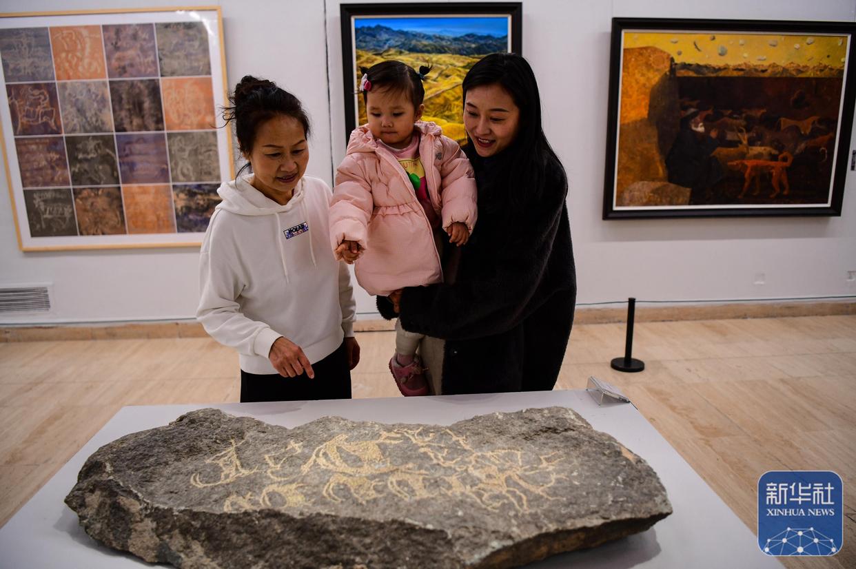 1月7日,观众在中国美术馆观看展出的阴山岩画展品。