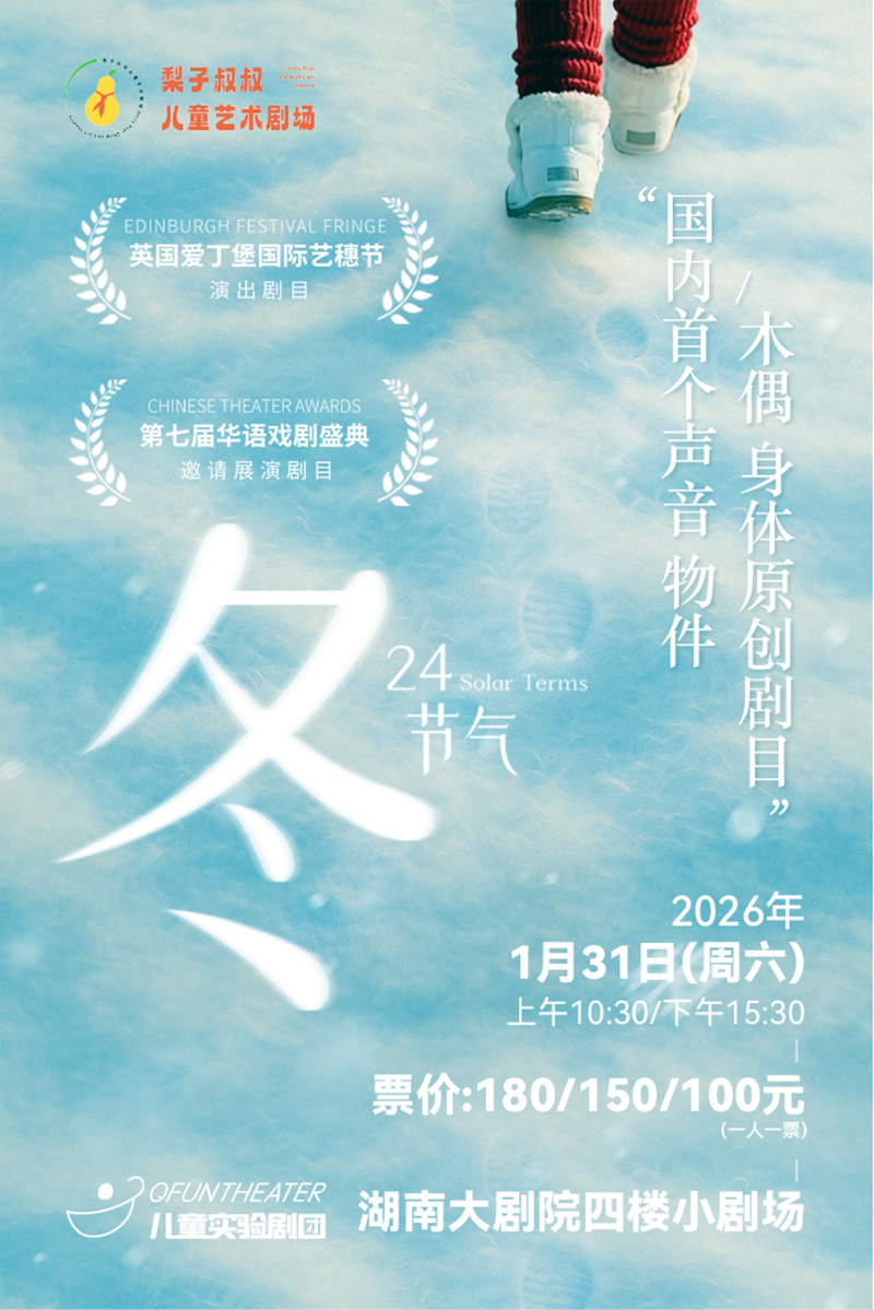 🔊简介:爱丁堡艺穗节演出剧目、第七届华语戏剧盛典邀请展演剧目——《24节气·冬》将于本周六在湖南大剧院小剧场精彩上演。由QFunTheater儿童实验剧团带来的国内原创首创儿童教育艺术剧场:将声音、物件、木偶、身体表演融合于一方舞台,让观众从单纯观看转变为亲身创造。这是一部孩子能“跳”着看的剧,在窗上哈气、在雪地里打滚、手拉手转圈,这些熟悉的日常动作在舞台上被无限放大。