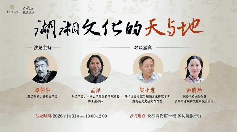 🔊简介:1月31日,长沙博物馆将为《家国天下湖湘情》特展举办一场别开生面的专家对谈沙龙。届时将特邀谭伯牛、孟泽、梁小进、彭晓玲四位深耕湖湘文化与近代历史研究的专家学者,沿着“家国天下湖湘情——近代湖南名人作品展”中近代湖南名人的足迹,共同探寻湖湘文化的精神高地与人文底色。