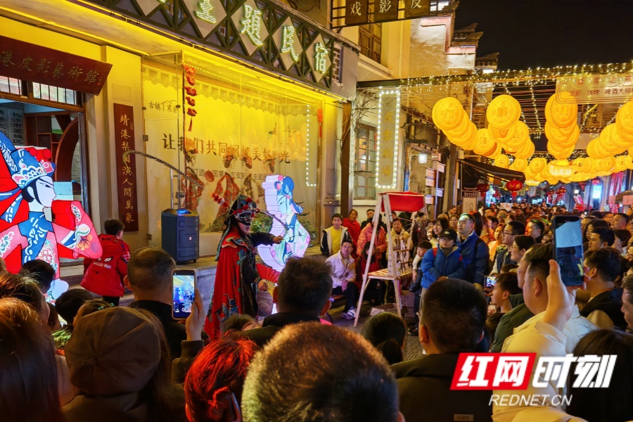 夜幕降临,古镇灯火璀璨。楚河码头上,挤满了驻足观赏的游客,好戏接连上演。不远处,鱼灯巡游队伍缓缓走来,鳌鱼灯摇曳生姿,NPC沿途撒“福”,沉浸式演绎重现“一夜鱼龙舞”的浪漫。