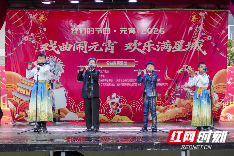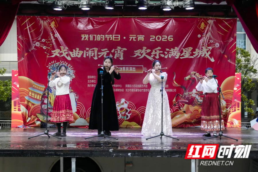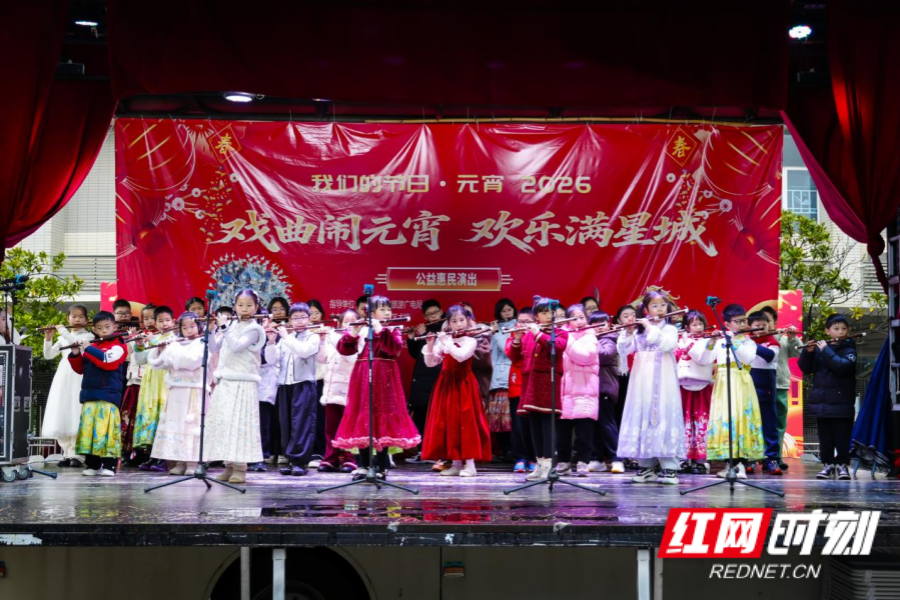 红网时刻新闻3月2日讯(记者 胡邦建 通讯员 陈浪 摄影 张国栋)2026“戏曲闹元宵·欢乐满星城”公益惠民演出正在长沙市群众艺术馆前坪广场持续举行。3月2日,“扬鞭催马踏歌行——竹笛专场音乐会”精彩上演,长沙市音乐家协会竹笛学会携专业笛手与少年乐团同台献艺,以清越灵动的笛声奏响新春乐章,为市民送上了一场文化盛宴。