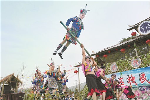 时刻新闻 —分享— 4月9日,通道侗族自治县坪坦乡下盘村,演员在表演民俗节目。当天,侗族群众和游客欢聚在一起,庆祝当地一年一度的“占匹拽民俗文化节”。近年来,该县打造了一批体验式、互动式民俗节庆品牌,推进文化和旅游深度融合。杨芝干摄 来源:湖南日报 编辑:施文