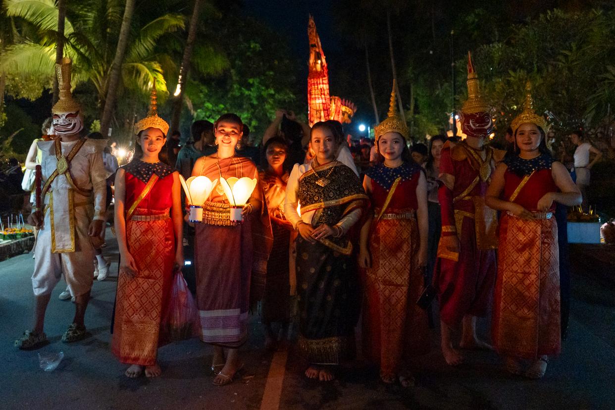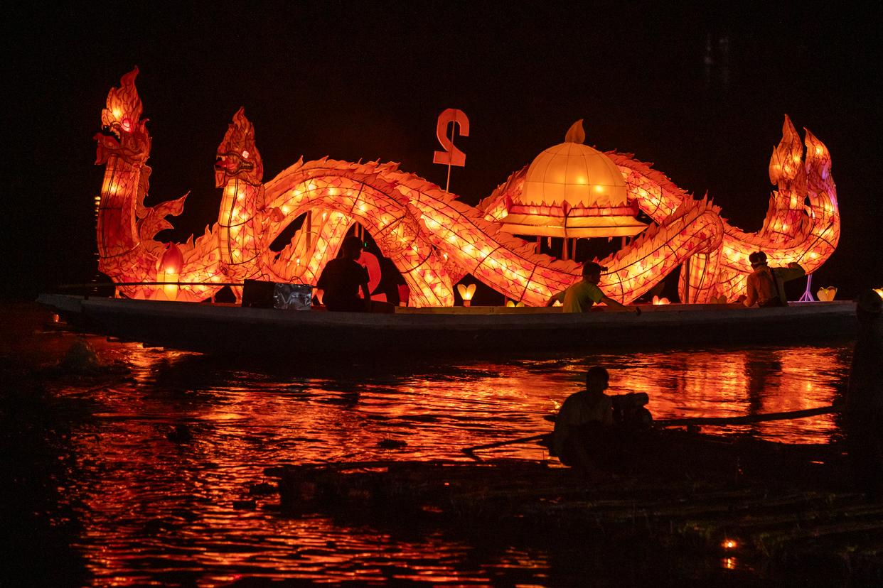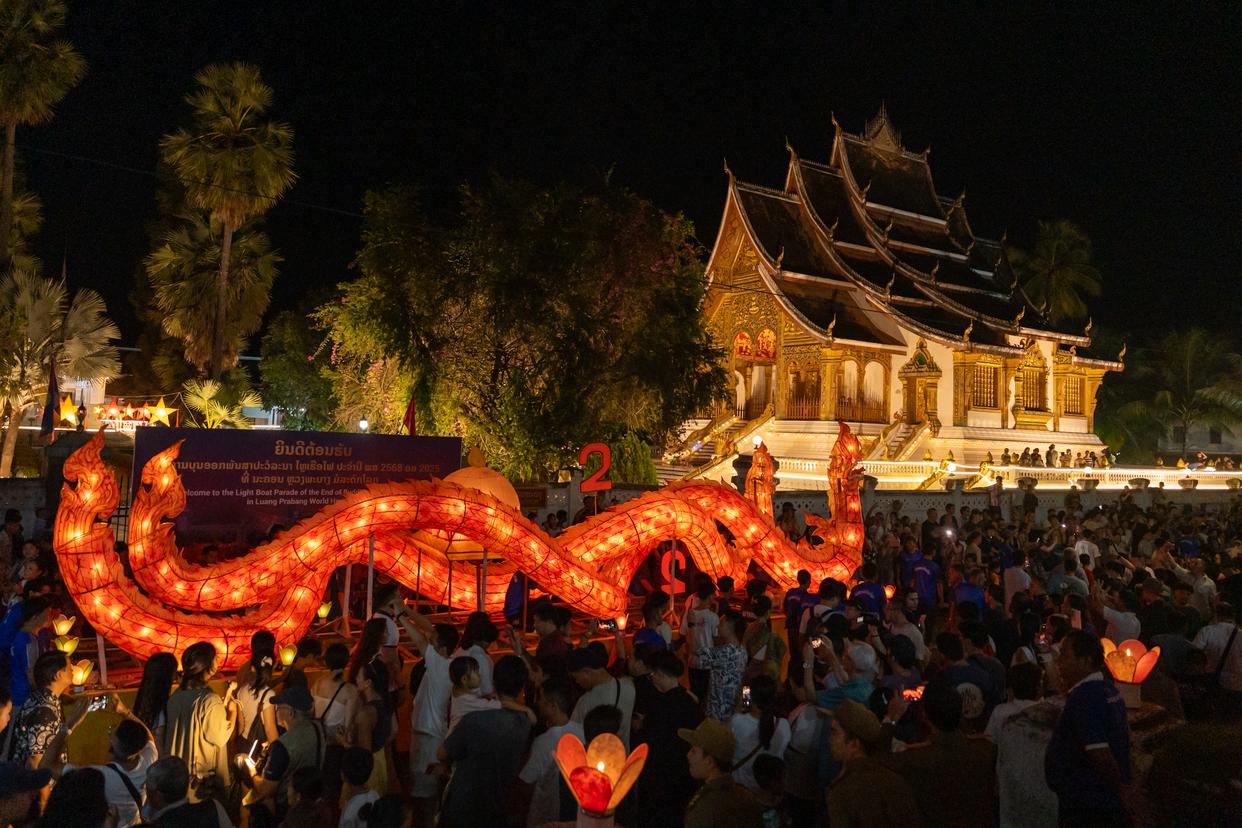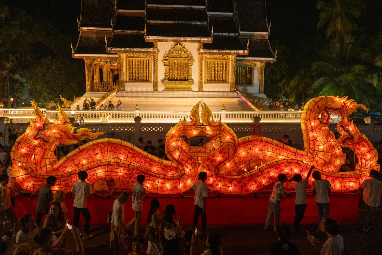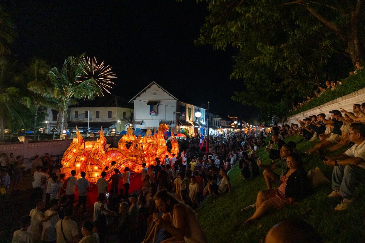 10月8日,老挝琅勃拉邦庆祝传统节日——灯船节。当晚,老挝琅勃拉邦的街头灯光闪烁,人们穿着传统服装参加灯船游行,将灯船放入湄公河中,祈求来年风调雨顺、幸福安康。