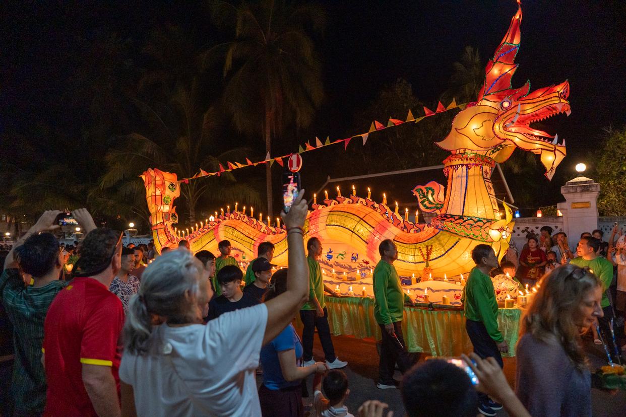 10月8日晚,灯船入水前在老挝琅勃拉邦主要街道游行,老挝民众和外国游客纷纷前来观看。新华社发(凯乔摄)