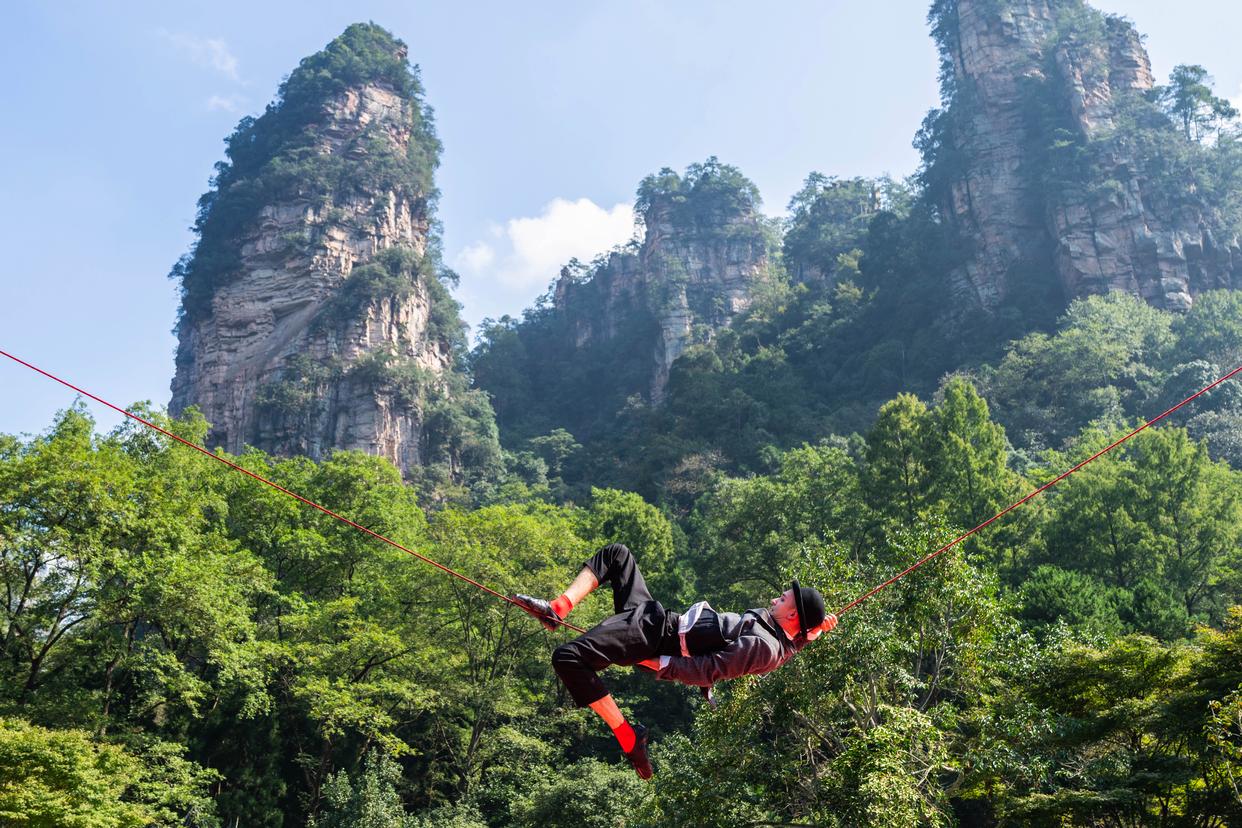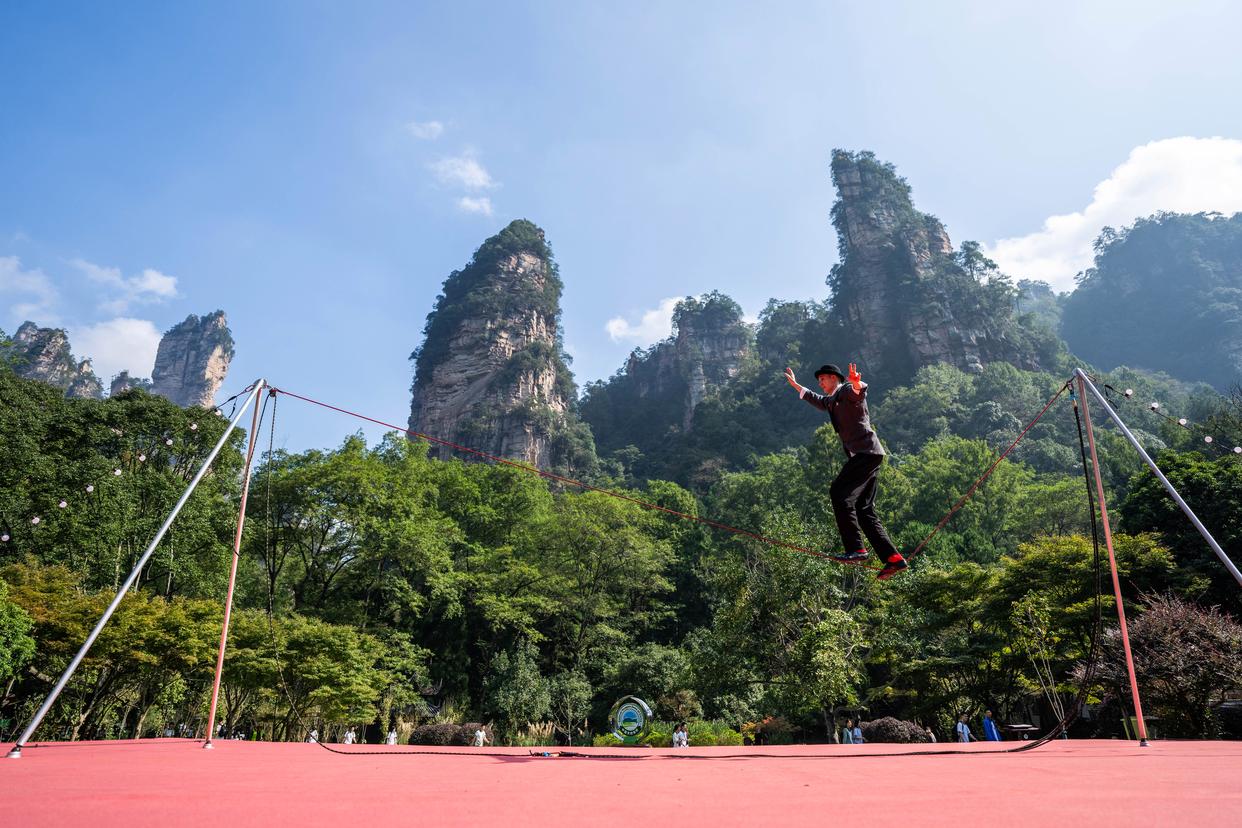 10月11日,来自俄罗斯的演员在张家界国家森林公园进行软钢丝杂技表演。新华社记者 陈思汗 摄