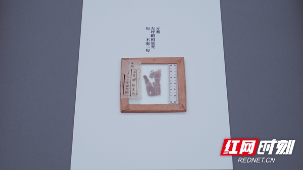 此外,此前长沙子弹库楚墓子弹库帛书唯一留存于国内的残片也在现场展出。该残片长4.6厘米,宽2.7厘米,上有红色界栏三行,现存黑色文字17个,其中14字清晰可辨。
