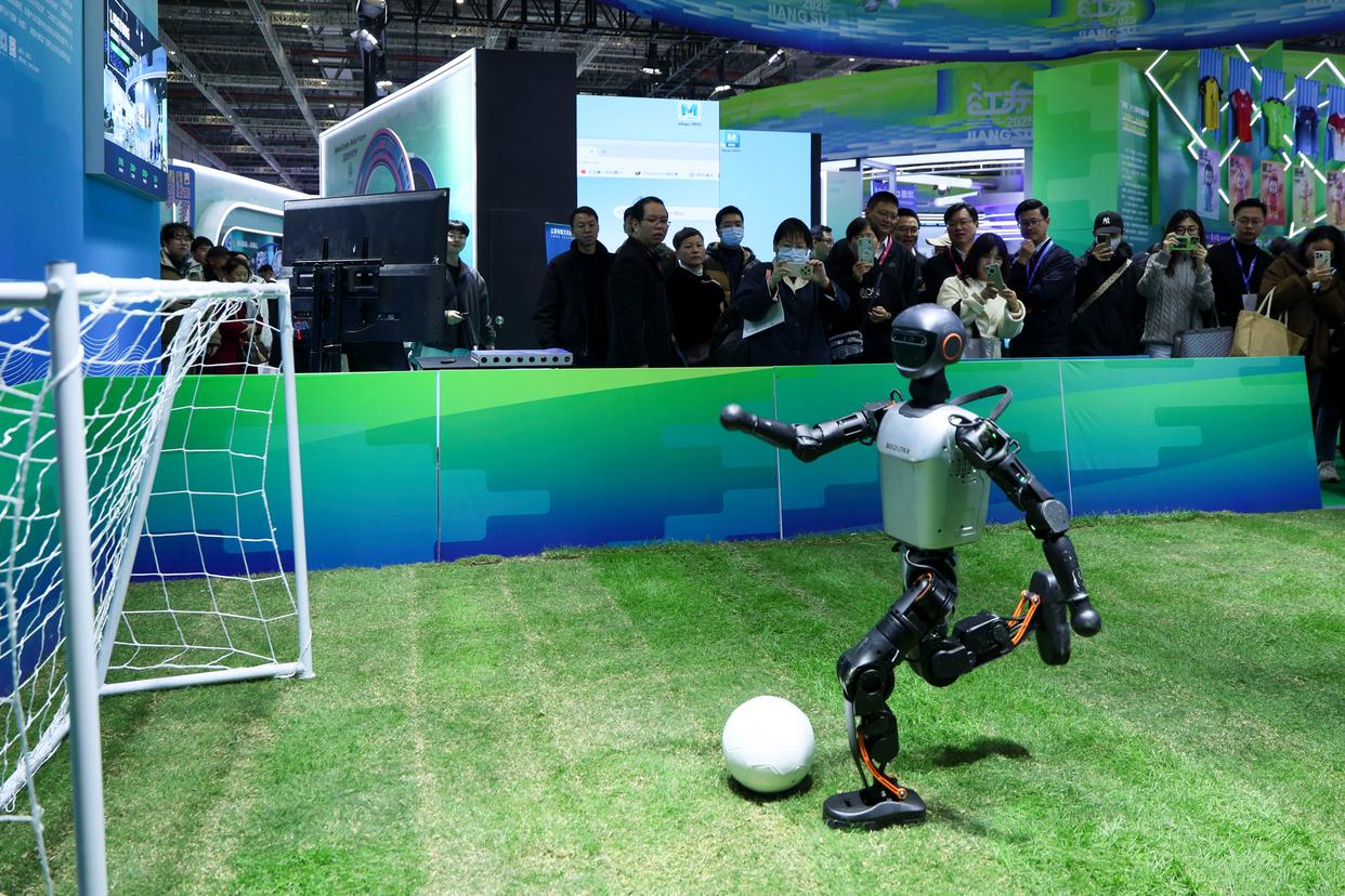 11月20日在江苏展区拍摄的机器人踢足球。新华社记者 王翔 摄